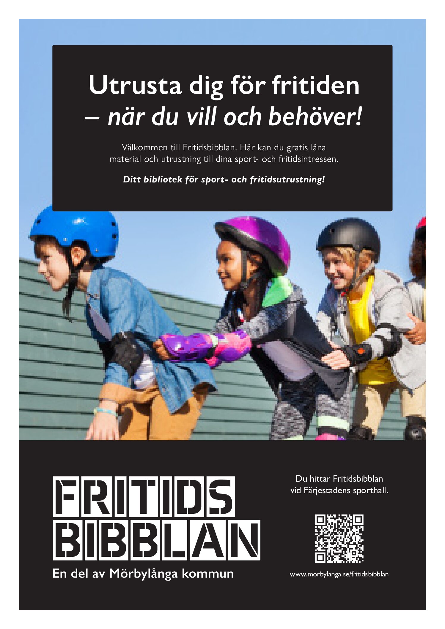 Du vet väl att du kan låna fritidsmaterial Fritidsbibblan – när du vill och behöver! På Fritidsbibblan kan du låna många olika sorters fritidsmaterial, allt från ridstövlar och bandyklubbor till skridskor och fotbollar.Från och med februari hittar du Fritidsbibblan vid Färjestadens sporthall! Låna gör du med hjälp av mobilt BankID eller Freja e-ID.Varmt välkommen!